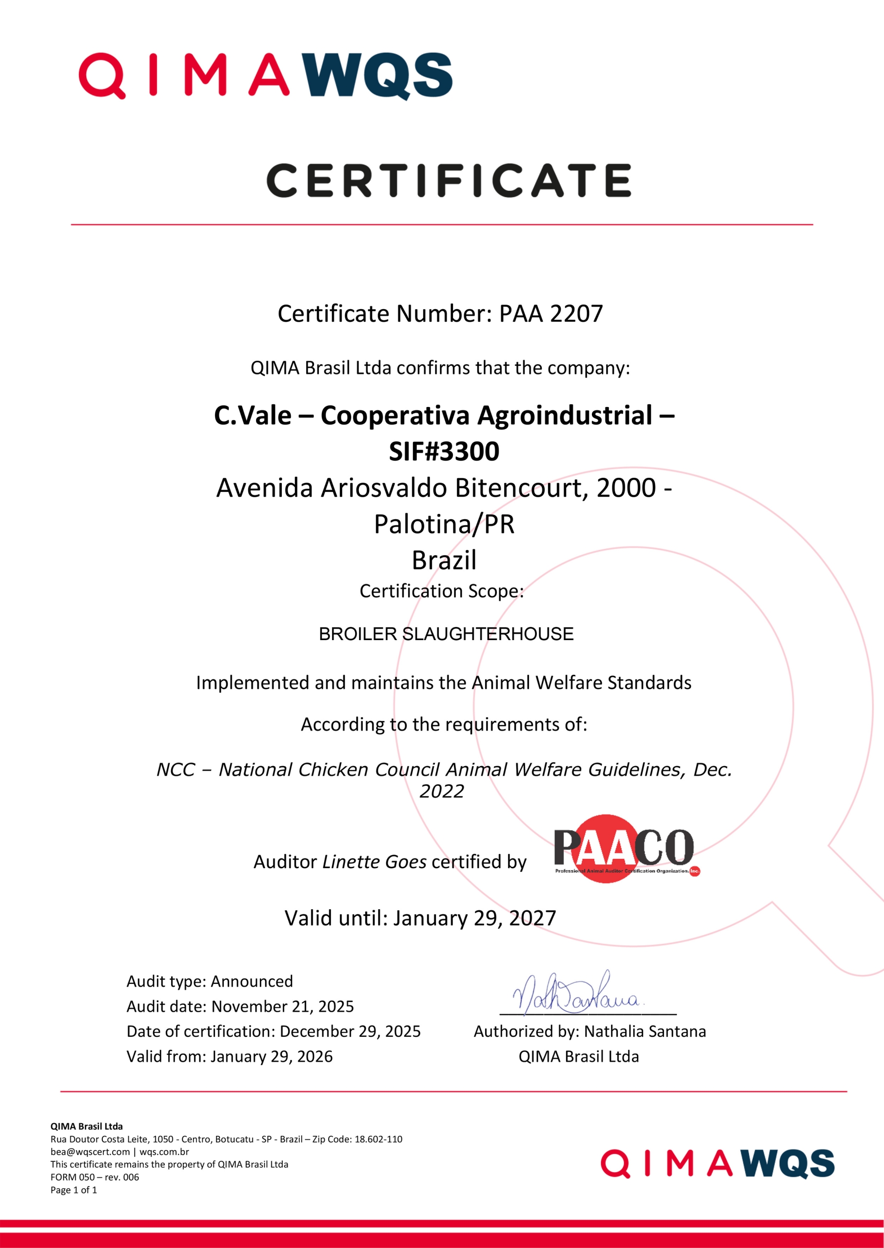 O abatedouro de aves segue a Norma do Sistema de Garantia da Segurança dos Alimentos HACCP – Codex Alimentarius, através da análise de todas as etapas de produção para o levantamento dos perigos existentes e a definição das medidas de controle, importantes para a segurança dos alimentos e através do certificado do sistema de Garantia Halal atende aos requisitos estabelecidos por comunidade religiosa muçulmana, também é certificado em bem estar animal pela PAACO (Professional Animal Auditor Certification) e segue a Norma NBR ISO 45001 do Sistema de Gestão de Segurança e Saúde no Trabalho.
