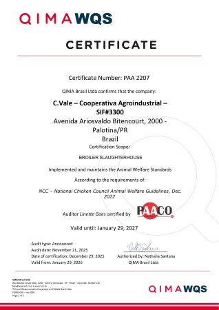 A C.Vale possui certificado BAP (Boas Práticas de Aquicultura) para os processos de Abate e processamento de tilápias in natura inteiras ou em partes (filé, ventrecha, postas e pele) congelados separadamente ou em volume, filés e tilápias resfriados, Carne Mecanicamente Separada e Carne Mecanicamente Moída congelado em volume, embalados em polietileno ou isopor e Certificação as normas do ASC (Aquaculture Stewardship Council) para a conformidade na produção da aquicultura e para os processos de Negociação de peixe (compra/venda), Transporte, Armazenamento, Distribuição, embalagem ou reembalagem, Processamento Primário e Secundário, e Preservação de Processamento e através do certificado do sistema de Garantia Halal atende aos requisitos estabelecidos por comunidade religiosa muçulmana,